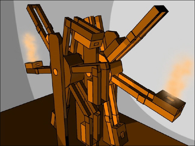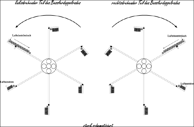 Hauptsache schön leicht und hart. Die kleinen Rechtecke meistens am Rande der Flügelräder sind eigentlich die öffnenden und wieder schließenden Gewichte für die Luftsäcke, die wir einfach weg gelassen haben, die Sie sich aber mit Leichtigkeit an den Flügelrädern hängend vorstellen können - im geknickten Zustand immer geschlossen und oben schräg nach außen öffnen sie sich immer und lassen die Luft mit ihrem Gewicht einströmen. Wenn das Flügelrad schräg nach unten sich neigt, dann schließt sich der Sack und alle können die Luftwolke sehen, die den Sack verläßt und ihn nach unten mittels Rückstoß befördert. |